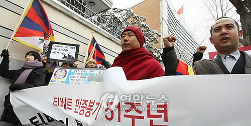 (서울=연합뉴스) 황광모 기자= 티베트 민중봉기 51주년을 맞이해 10일 서울 효자동 주한중국대사관 앞에서 열린 기자회견에서 주한 티베트인과 티베트 독립 관련 시민단체 회원들이 중국 정부의 티베트 통치 중지와 티베트의 독립을 요구하는 내용의 구호를 외치고 있다. 2010.3.10