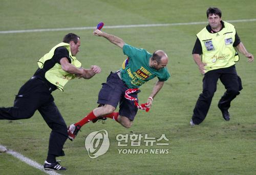 < yonhapPHOTO-0379 > A pro-Tibet protestor wearing a jersey reading "Tibet is not China" is being chased by stewards as he runs onto the field during the semifinal match between Germany and Turkey in Basel, Switzerland, Wednesday, June 25, 2008, at the Euro 2008 European Soccer Championships in Austria and Switzerland. (AP Photo/Peter Klaunzer)/2008-06-26 07:48:26/