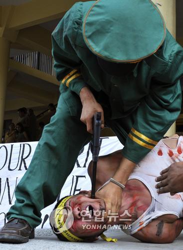 < yonhapPHOTO-1271 > Exiled Tibetans enact a street play depicting the alleged torture of Tibetans by the Chinese government, in Dharmsala, India, Tuesday, June 17, 2008. Hundreds of Tibetans took to the streets Tuesday, with banners to oppose the Beijing Olympic Torch relay which reaches Lhasa on June 21. (AP Photo/Ashwini Bhatia)/2008-06-17 16:36:18/