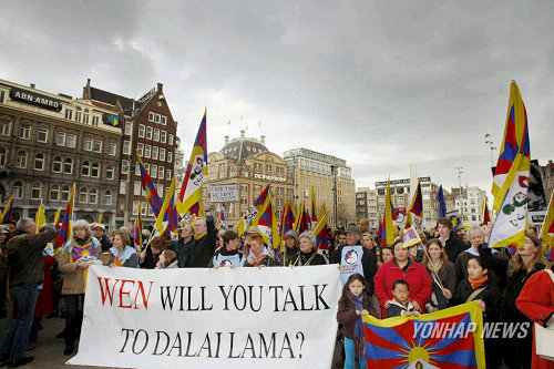 epa01301221 31일 네덜란드 암스테르담의 담 광장에서 티베트 망명자들과 일반 시민들이 모여 티베트 사태에 대한 시위집회를 열고있다. 네덜란드는 티베트인들을 지지하고있다.